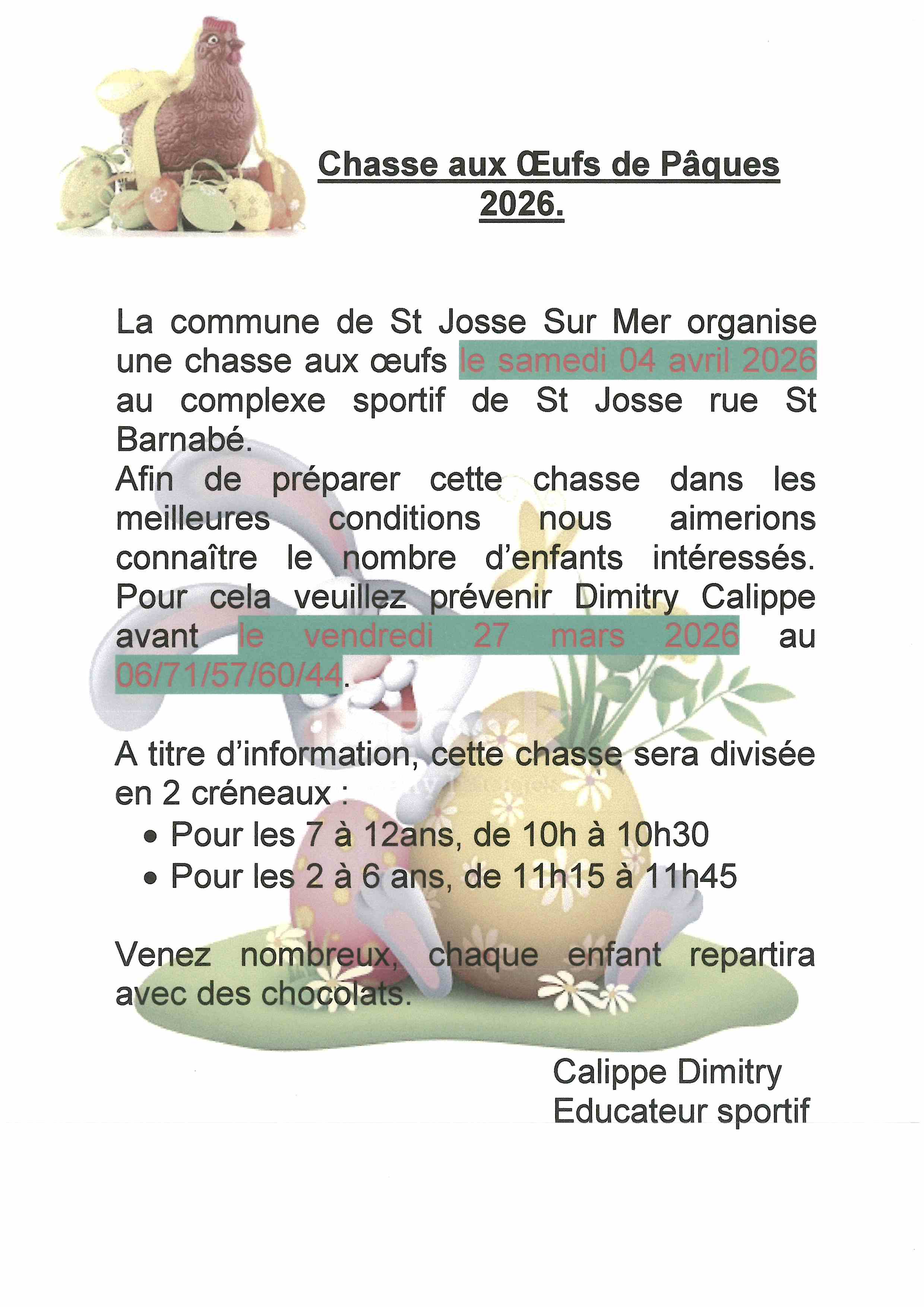 La traditionnelle chasse aux oeufs de pâques des enfants se déroulera le samedi 4 avril 2026.
